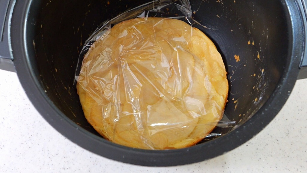 加熱直後はとても柔らかいです。内鍋の中でしっかり冷ましてから、ケーキの上にラップをおき、手で支えながら内鍋を逆さまにして取り出します。または、内鍋をスライドして取り出します。詳しい手順は動画にてご確認ください。