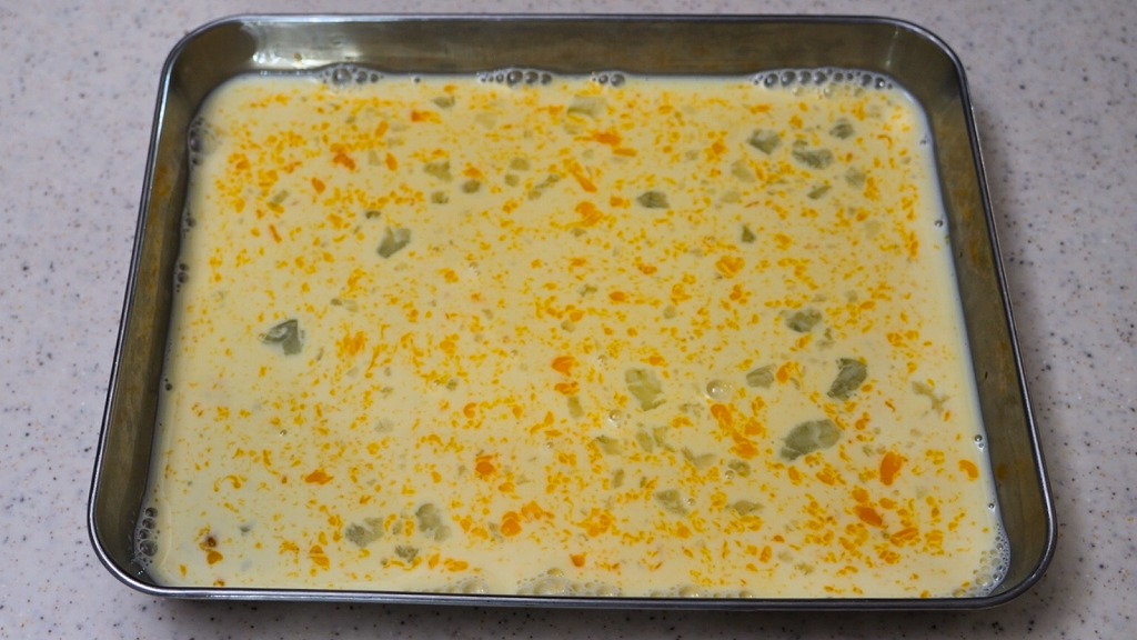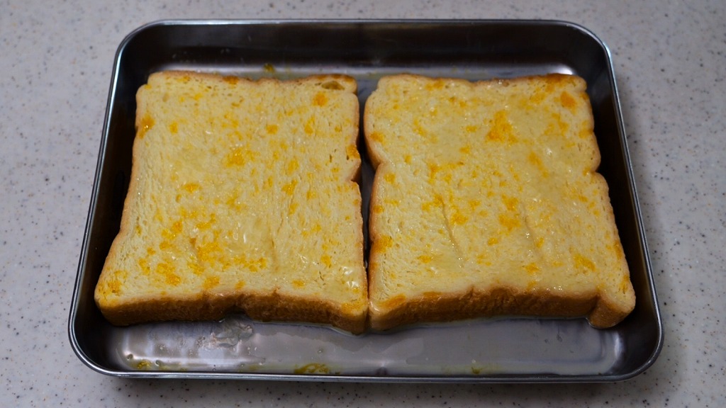 ・たまに食パンを動かしたりしてバットから卵液がなくなるまで、しっかりと浸します。