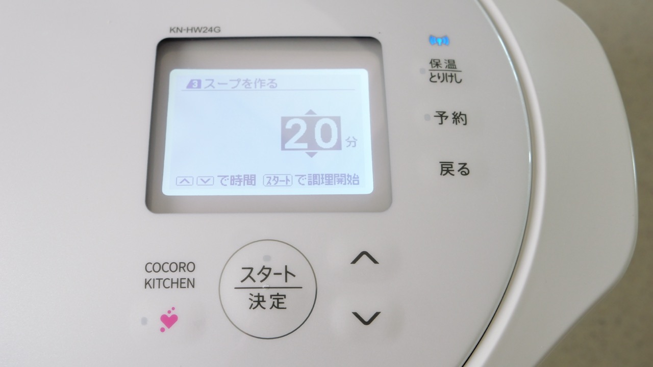 本体に内鍋をセットしてフタを閉め、手動で作る→スープを作る(まぜない)20分で加熱をスタートします。