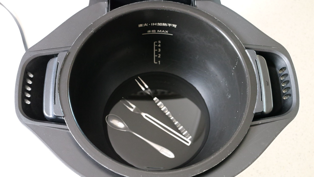 スプーンや小さな容器などを消毒したい場合は、このタイミングで内鍋の水に浸るように入れます。