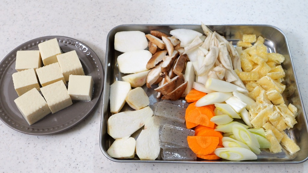 油揚げ(1枚)は細切り、里芋(100g)は一口大、木綿豆腐(150g)は角切りにカット。その他の具材は写真くらいの薄切りにし、ごぼうは水にさらして水をしっかりきっておきます。
