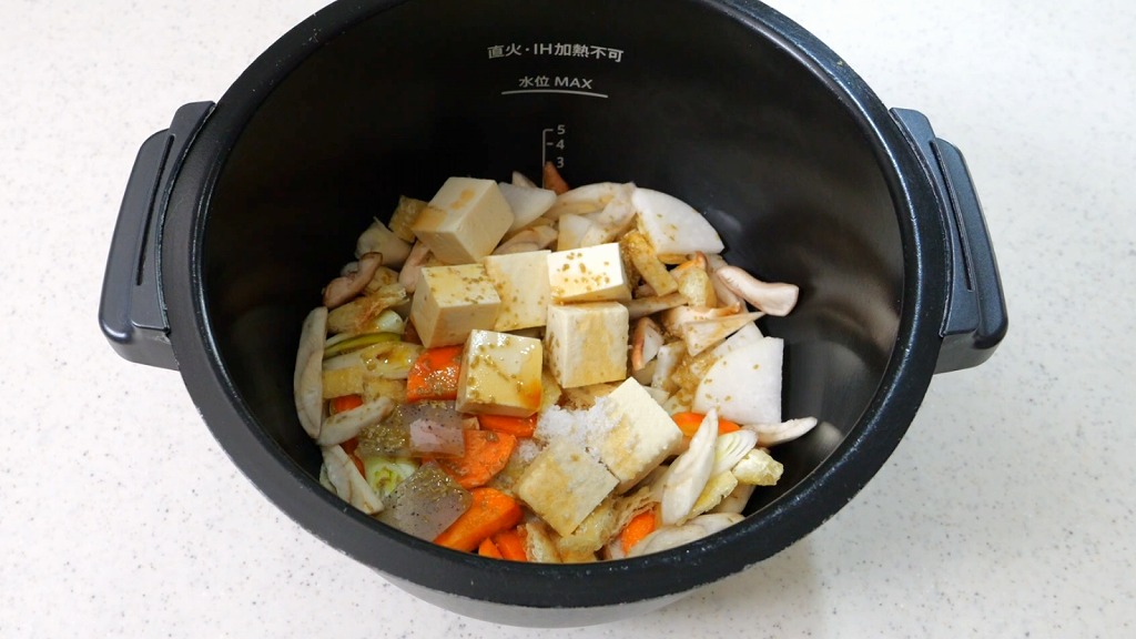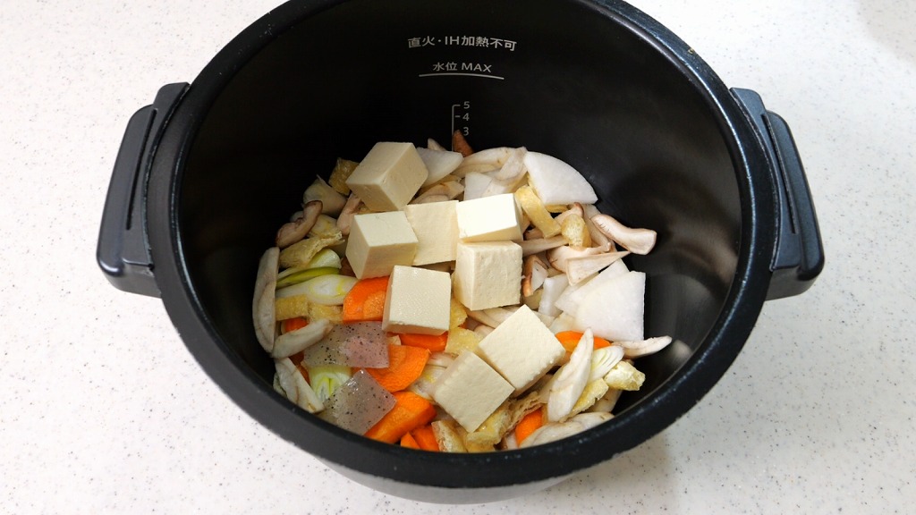内鍋にカットした野菜、こんにゃくを入れて全体に広げ、一番上に豆腐をそっと乗せます。豆腐が崩れないように、優しく乗せるのがポイントです。