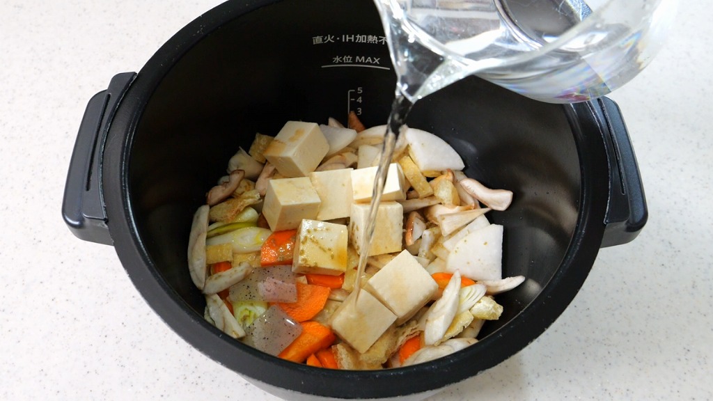 水(600ml)を入れます。調味料を溶かすような感じで、調味料めがけて回し入れます。