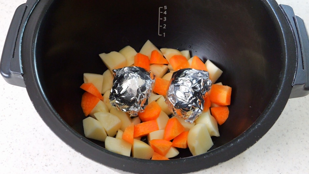 内鍋に、ジャガイモ(300g/2cm角)、人参(80g/小さめの乱切り)を入れ、その上にアルミホイルを巻いた卵(2個)を乗せます。最後に水(大さじ3)を回し入れます。