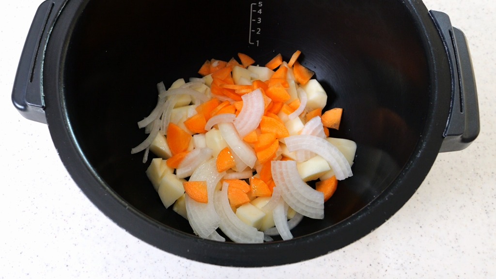 内鍋に、ジャガイモ(300g/2cm角)、玉ねぎ(50g/薄切り)、人参(50g/5mmいちょう切り)を入れ、水(大さじ4)を加えます。
