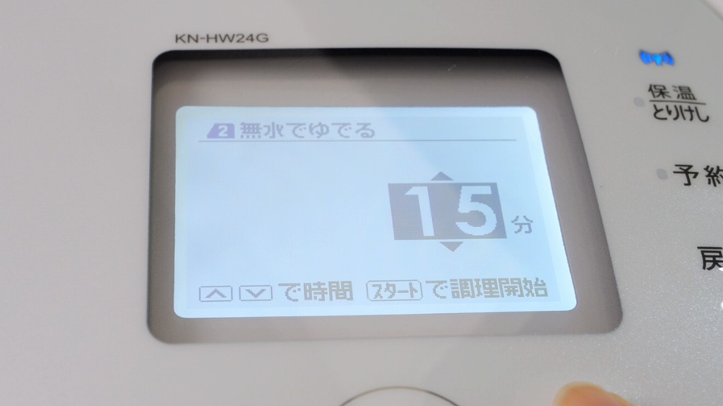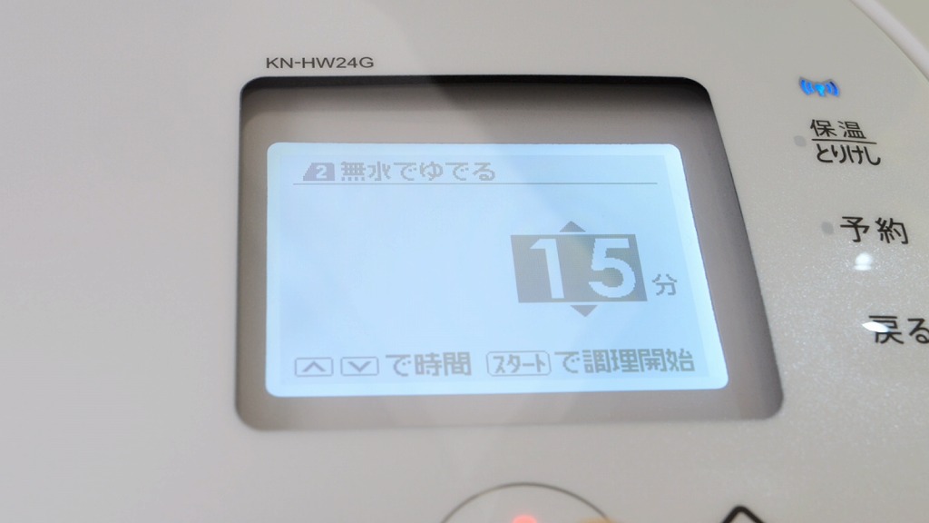 内鍋を本体にセットして、手動で作る → 無水でゆでる → 15分 で設定してスタート。
