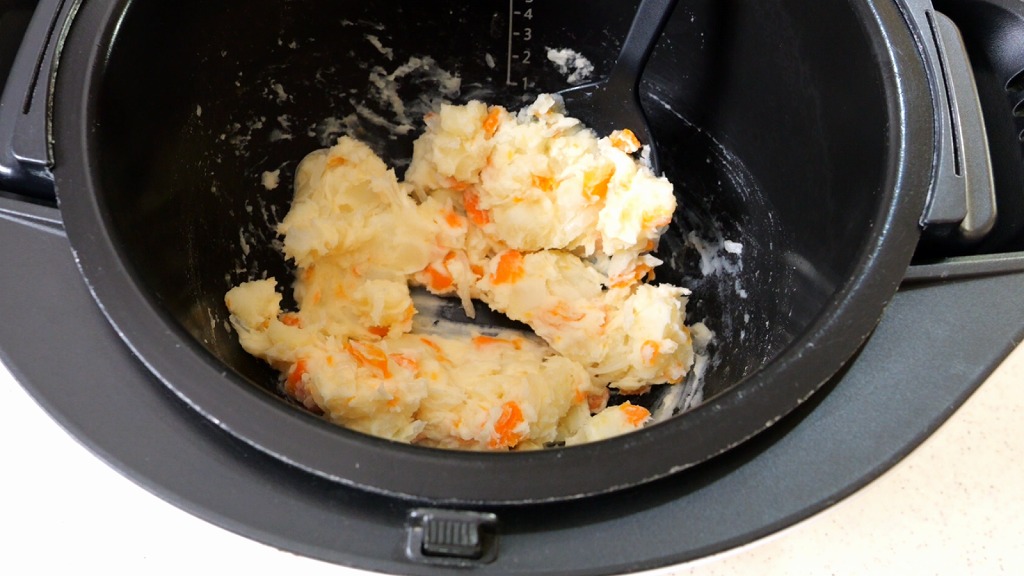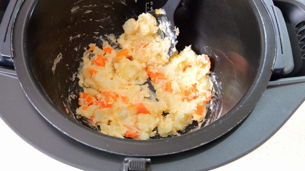 加熱が終わったらフタを開け、火傷に注意しながら卵を取り出します。内鍋に残ったジャガイモと人参に、砂糖(小さじ1)、マヨネーズ(大さじ4〜)、塩(適量)を加えてシリコン製のスプーンでジャガイモを潰しながら混ぜます。