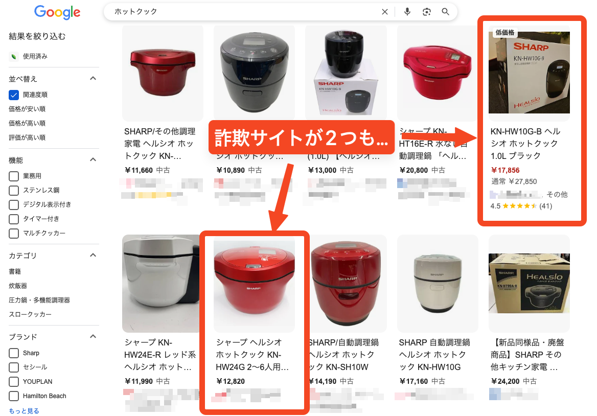 というのも実は現在、Googleのショッピング検索ですら、ホットクックを不自然な安値で販売する詐欺サイトが複数ヒットする状況になっているんです。おそろしい。