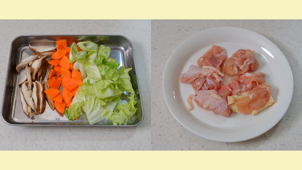 椎茸、人参、長ねぎは薄切りに、白菜と鶏もも肉は食べやすい一口大にカットしておきます。冷凍うどんは凍ったままでOKです。