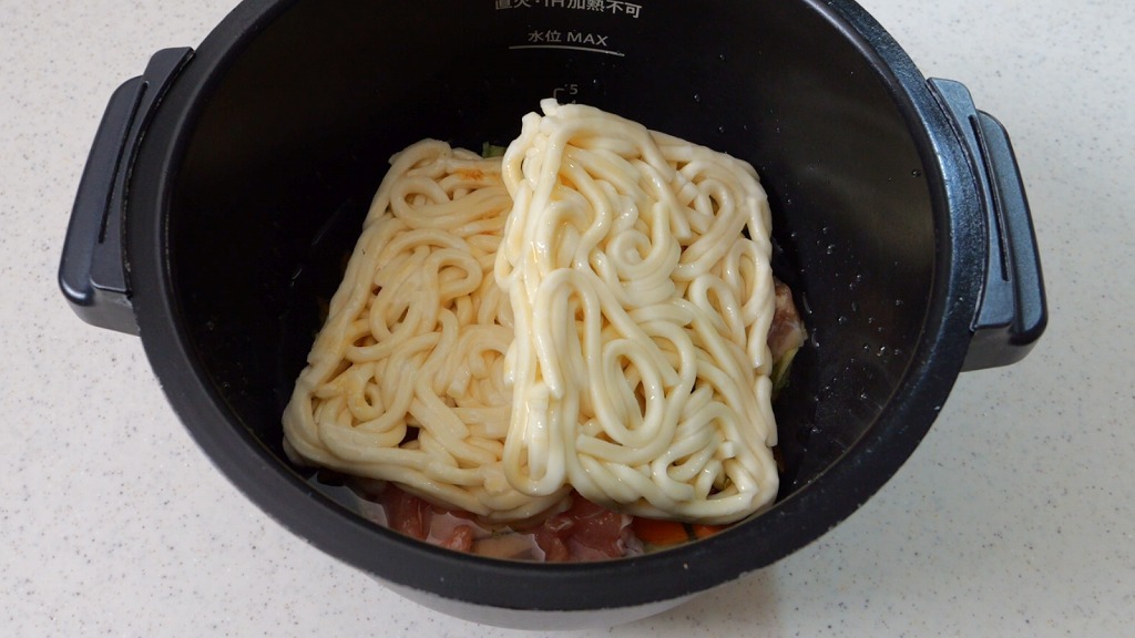 内鍋に、野菜(200g)→鶏もも肉(100g)→冷凍うどん(2玉)→うどんスープ(2袋)→水(600ml)の順番で入れていきます。